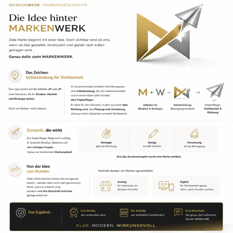 Markenwerk entstand aus der Vision, kleinen und mittelständischen Unternehmen durch klare, moderne Gestaltung zu stärkerer Sichtbarkeit zu verhelfen. Unser Fokus liegt auf individuellen Designs, die durch Struktur und Klarheit überzeugen. Wir arbeiten lokal, nah am Kunden mit großem Anspruch an Qualität und Professionalität.